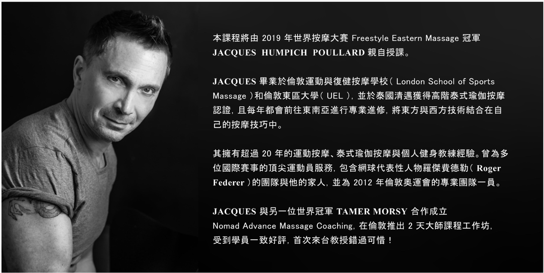 課程將教授講師 Jacques 20年累積的按摩與教學核心技術,結合東西方按摩手法的精髓,聚焦於 前側與側向肌肉鏈,透過按摩與瑜伽靈感動作,達到深層放鬆、動作整合與身體平衡。